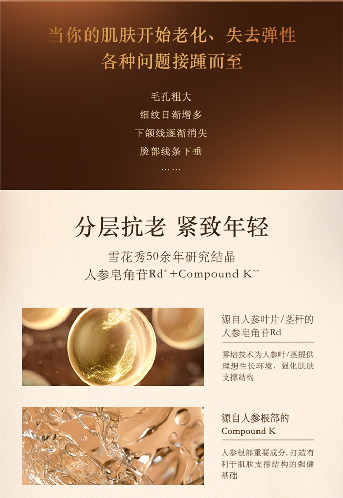 “时光精华”——逆行青春 执掌时光。蕴含与人参皂角苷Rd、Compound K及升级版人参活能微粒™ (Ginsenisphere™),分层抗老,强健肌底、强化支撑,8周见证奇迹蜕变, 肌肤立现弹润、立体、强韧,帮助女性面对时光淡然自处,不为时光所动。
